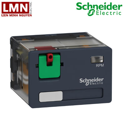 Relay trung gian RPM Schneider gồm cờ báo trạng thái tiếp điểm, nút nhấn tự nhả, đèn LED báo trạng thái và các module bảo vệ sốc dòng điện.